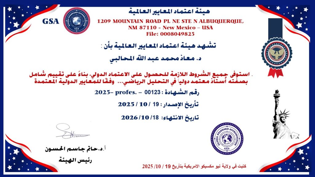 منح الدكتور معاذ المحالبي “الاعتماد الدولي” (International Accreditation) في مجال تخصصه، اعترافاً بتميزه الأكاديمي والبحثي والمهني، واستيفائه لكافة المعايير العالمية المطلوبة.